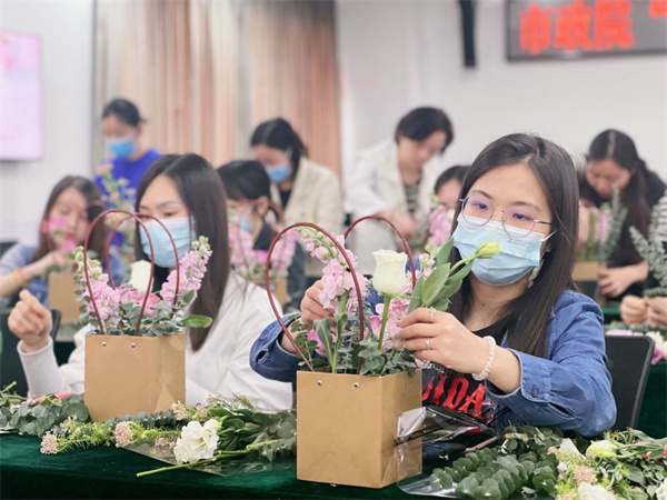 共享美好課程,巧手扮靚人生?;ㄋ嚮顒蝇F(xiàn)場花香四溢,熱鬧非凡,花藝?yán)蠋熤v授養(yǎng)花、插花及作品欣賞等知識,每位女同胞自己動手插花,認(rèn)真構(gòu)思,修剪枝葉,興致勃勃地創(chuàng)作,熱烈地相互交流,花材變成了一盆盆錯落有致、色彩鮮艷、造型各異的插花作品,現(xiàn)場充滿歡聲笑語。