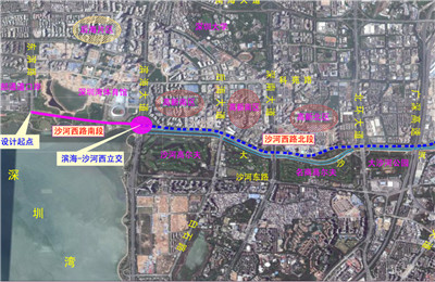 沙河西路位于深圳市南山區(qū),起點位于東濱路,終點至茶光路口,全長約7.43公里。按城市快速路標準建設(shè),主線雙向6車道,主線設(shè)計車速60km/h,濱海-沙河西立交部分匝道設(shè)計車速50km/h,其余輔道及匝道設(shè)計車速30公里/小時。改造內(nèi)容包括:主車道和兩側(cè)輔道路面加鋪瀝青混凝土,完善全線輔道系統(tǒng)、主輔出入口及立交節(jié)點的改造優(yōu)化,新建人行過街天橋6座,延長現(xiàn)狀天橋1座,新增港灣式公交站6對,重新鋪設(shè)人行道板磚,更換現(xiàn)狀混凝土立道牙、完善交通及交通監(jiān)控設(shè)施以及完善相關(guān)市政管線設(shè)施等。