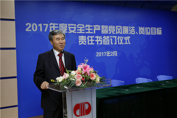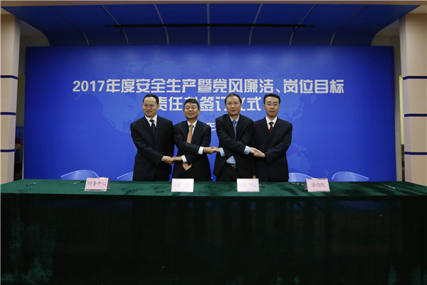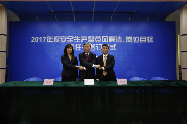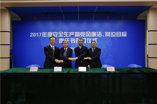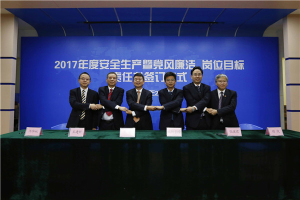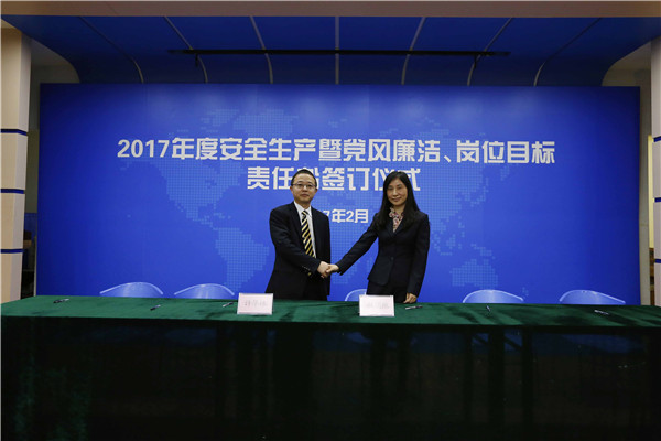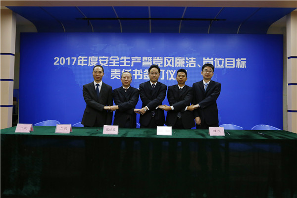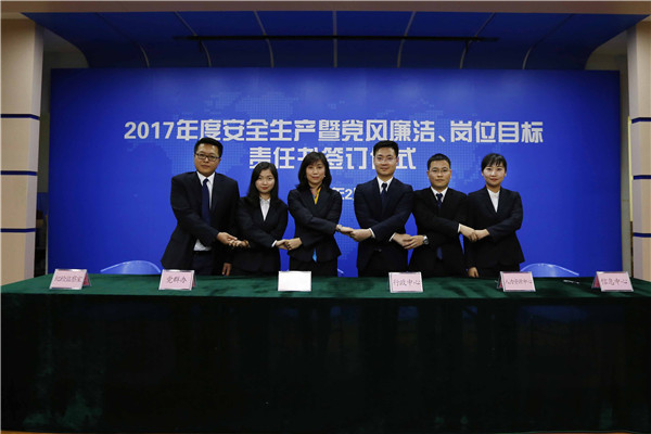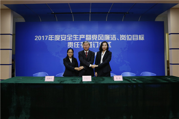 儀式開始,黨委書記、董事長陳宜言與黨委副書記、總經(jīng)理蔡明和黨委副書記、紀(jì)委書記、工會(huì)主席郭明簽署了《2017年度崗位目標(biāo)責(zé)任書》、《2017年度黨風(fēng)廉潔責(zé)任書》及《2017年度安全生產(chǎn)責(zé)任書》??偨?jīng)理蔡明與副總經(jīng)理歐陽宇峰、副總經(jīng)理王建新、副總經(jīng)理張健君、副總經(jīng)理許華林、總工程師徐波簽署責(zé)任書。緊接著,各分管領(lǐng)導(dǎo)與分管部門負(fù)責(zé)人簽署責(zé)任書?!?/span>2017年度崗位目標(biāo)責(zé)任書》的簽訂對(duì)各部門的工作目標(biāo)進(jìn)行了進(jìn)一步的細(xì)化和分解,《2017年度黨風(fēng)廉潔責(zé)任書》的簽訂是提高全體黨員和領(lǐng)導(dǎo)干部廉潔從業(yè)意識(shí)的重要舉措,《2017年度安全生產(chǎn)責(zé)任書》為提升我司安全生產(chǎn)管理水平,實(shí)現(xiàn)“安全生產(chǎn)無責(zé)任事故”的年度目標(biāo)奠定良好的基礎(chǔ),確保我司“項(xiàng)目、資金、生產(chǎn)、干部”四個(gè)安全,為我司打造“百年老店”的目標(biāo)提供堅(jiān)強(qiáng)的保障。