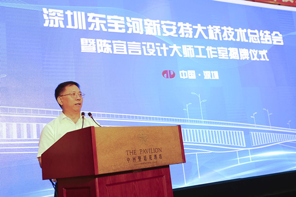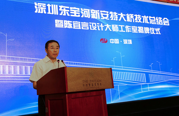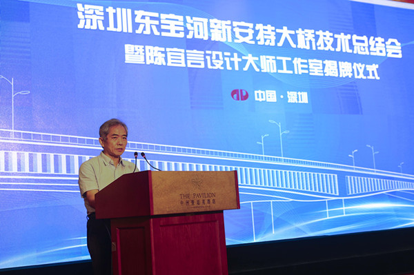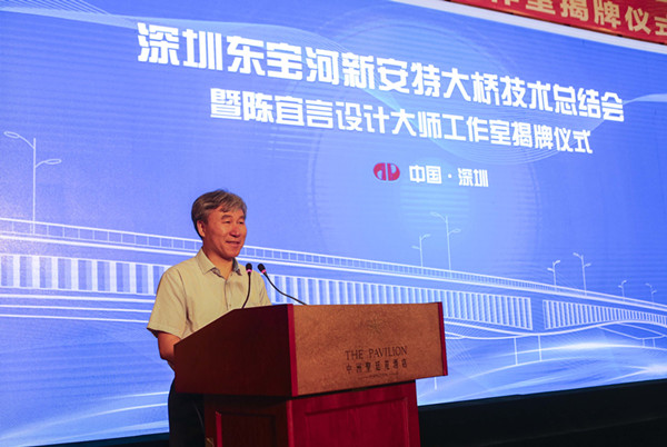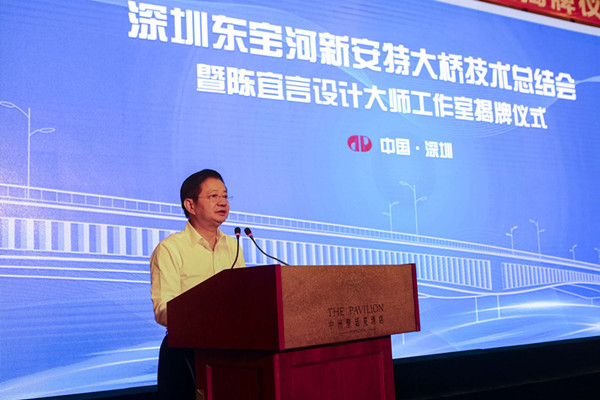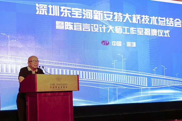 2017年7月29日,深圳東寶河新安特大橋技術(shù)總結(jié)會暨陳宜言設(shè)計大師工作室揭牌儀式在圣廷苑酒店隆重舉行。中國工程院孟建民、聶建國、陳政清等3位院士,全國工程勘察設(shè)計大師王用中、羅玲(女)、車宇琳、丘建金、何昉等7位大師,11所全國重點(diǎn)高校15名組合結(jié)構(gòu)教授,以及深圳市委組織部、市科協(xié)、市交委、市國資委、市住建局、市地質(zhì)局、市人社局、國新南方知識產(chǎn)權(quán)研究院、地鐵集團(tuán)領(lǐng)導(dǎo),行業(yè)協(xié)會領(lǐng)導(dǎo)及專家160余人出席大會。地鐵集團(tuán)陳湘生總工程師主持會議,陳宜言設(shè)計大師和清華大學(xué)聶建國院士、東南大學(xué)宗周紅教授分別作了專題技術(shù)報告。