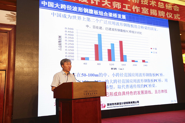 揭牌儀式后進(jìn)入技術(shù)交流環(huán)節(jié),陳宜言設(shè)計大師、清華大學(xué)聶建國院士和東南大學(xué)的宗周紅教授先后作了關(guān)于波形鋼腹板組合梁橋和鋼結(jié)構(gòu)橋梁的技術(shù)報告。報告依托陳宜言大師技術(shù)團(tuán)隊設(shè)計的深圳東寶河新安特大橋和伊朗德黑蘭BR-06L/R特大橋,在體系研究、方案設(shè)計、試驗研究、實橋試驗及創(chuàng)新性成果等方面進(jìn)行了細(xì)致的介紹。