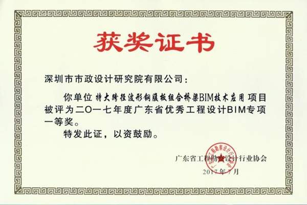 近日,我公司“特大跨徑波形鋼腹板組合橋梁BIM技術(shù)應用”項目被評為2017年度廣東省優(yōu)秀工程設計BIM專項一等獎。