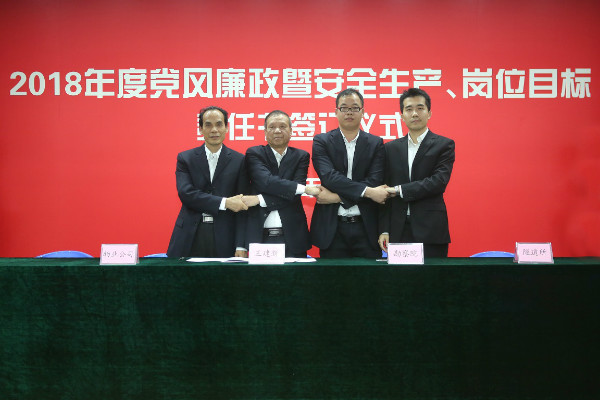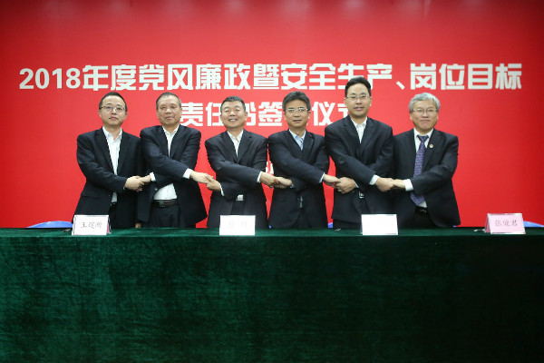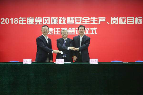 儀式開始,黨委書記、董事長(zhǎng)陳宜言與黨委副書記、總經(jīng)理蔡明和黨委副書記、紀(jì)委書記、工會(huì)主席郭明簽署了《2018年度崗位目標(biāo)責(zé)任書》、《2018年度黨風(fēng)廉政責(zé)任書》及《2018年度安全生產(chǎn)責(zé)任書》。黨委副書記、總經(jīng)理蔡明與副總經(jīng)理歐陽(yáng)宇峰、副總經(jīng)理王建新、副總經(jīng)理張健君、副總經(jīng)理許華林、總工程師徐波簽署責(zé)任書。緊接著,各分管領(lǐng)導(dǎo)與分管部門負(fù)責(zé)人簽署責(zé)任書。
