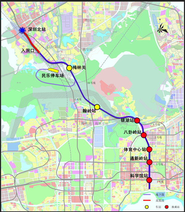 由深圳市市政設(shè)計(jì)研究院有限公司承接的總體總包項(xiàng)目——深圳地鐵6號(hào)線二期工程,北起深圳北站,南至科學(xué)館站,線路全長11.773公里,經(jīng)民樂、梅林、銀湖、泥崗、八卦嶺、園嶺等6個(gè)片區(qū)。線路共設(shè)7座車站,均為地下站,其中銀湖站、八卦嶺站、體育中心站、通新嶺站和科學(xué)館站為換乘站,梅林關(guān)站和翰嶺站為標(biāo)準(zhǔn)站,與6號(hào)線一期工程同步開通,共享一期工程長圳車輛段,增設(shè)民樂停車場。