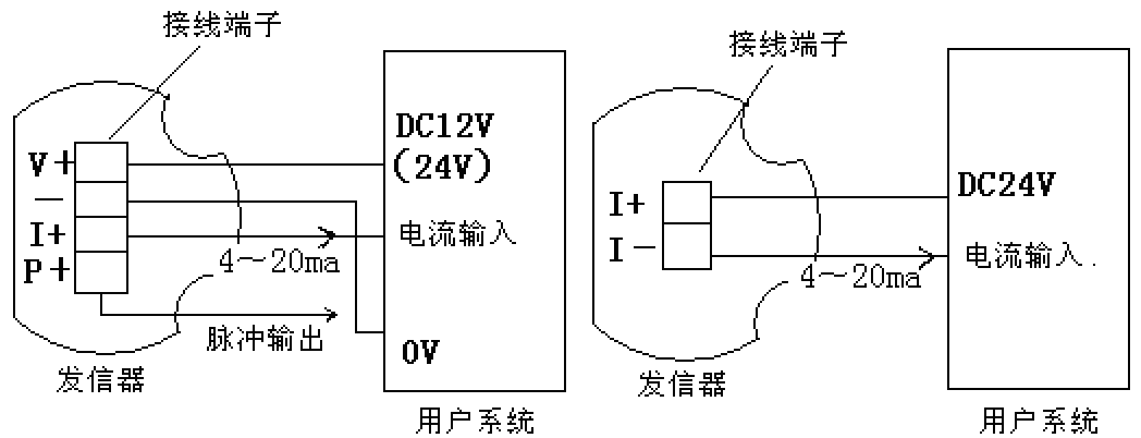 注:僅要4~20mA輸出時(shí)為三線制,供貨時(shí)脈沖信號(hào)線未外引。