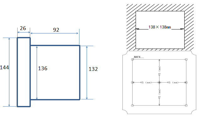 儀表可上盤嵌入安裝或壁掛式安裝,盤裝開孔見圖一,開孔尺寸為 138×138mm。將儀表嵌入方孔中,用配置的支架固定即可。壁掛式可根據(jù)配置壁掛式配件安裝或按照?qǐng)D一尺寸開孔固定。