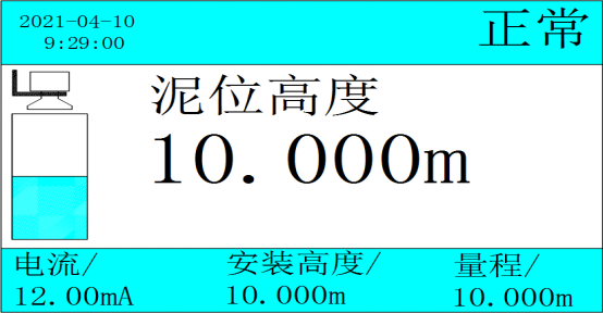 圖四 儀表屏幕主顯示其中第一行左上為年月日時(shí)分秒;第一行右上角顯示當(dāng)前狀態(tài);中間顯示當(dāng)前泥位高度,帶填充動(dòng)畫顯示,第三行為當(dāng)前泥位計(jì)的輸出電流、安裝高度、量程