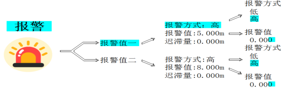 “報(bào)警”菜單樹狀圖,按“SURE”鍵進(jìn)入菜單,“MOVE”、“UP”、“DOWN”修改數(shù)值,“BACK”鍵返回上機(jī)菜單