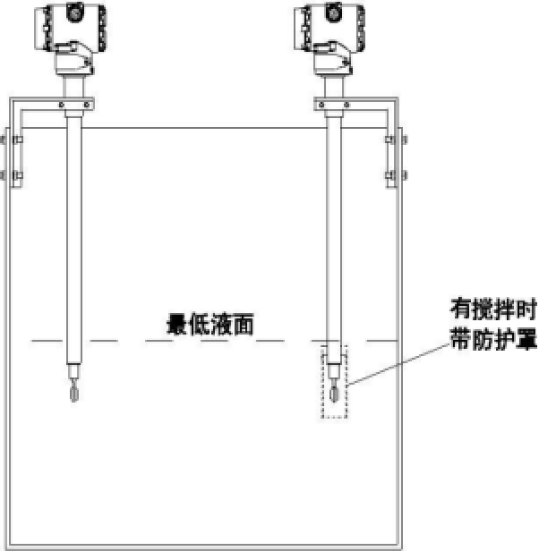敞口池或開(kāi)口罐安裝時(shí),采用支架固定,音叉叉體必須在最低液面以下才能測(cè)量,當(dāng)敞口池或開(kāi)口罐中有攪拌時(shí),需要帶防護(hù)罩,這種安裝方式音叉插入桿較長(zhǎng),最長(zhǎng)可做到4米。