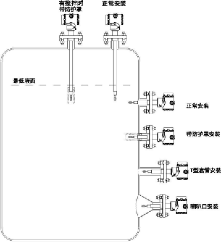 A、 罐體頂部安裝時(shí),與敞口池安裝類似,音叉叉體應(yīng)在液面以下,有攪拌時(shí)需帶防護(hù)罩,一般針對(duì)只有頂部開(kāi)口的罐或埋地罐。要改變插入深度,可以使用一段帶有法蘭的支座。