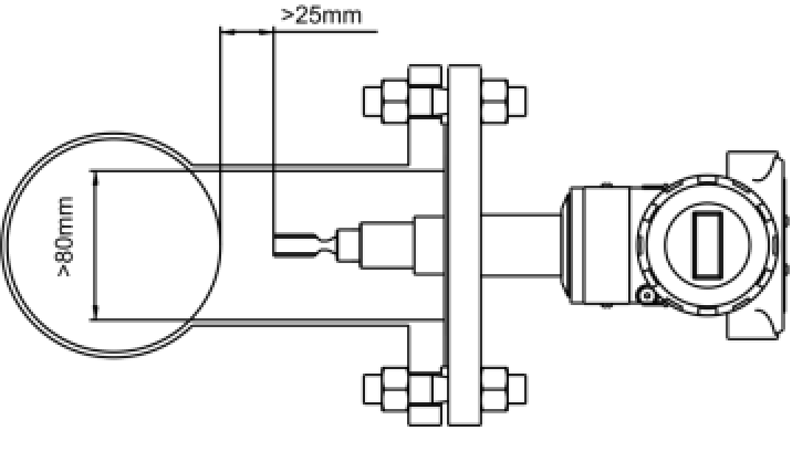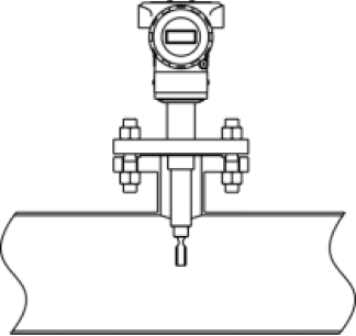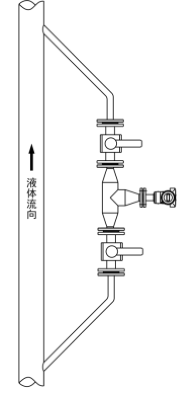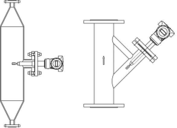 當(dāng)主管道口徑較小時(shí),可使用變徑安裝,如左圖。當(dāng)管道流速較高,有沉淀且有氣泡時(shí),采用右圖安裝,右圖部分可作為附件提供,其典型應(yīng)用為脫硫石灰漿密度測(cè)量領(lǐng)域。