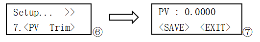 長(zhǎng)按 M 鍵 5 秒以上,進(jìn)入設(shè)置菜單,按 6 次 S 鍵,進(jìn)入菜單 7 <PV Trim> ⑥。